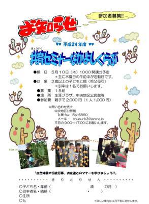 以前、小正月のだんごさげや『冬まつり交流会』でご紹介した『共育セミナーなかよしくらぶ』が、平成24年度の参加者を募集しています(*^▽^*)対象は、2歳以上の子どもと親(祖父母可)※引率は1名場所は、生涯プラザや中央地区公民館等参加費は、親子で2,000円(1人1,000円)※年間開講式は、5月10日(木)10:00の予定です。就園前のお子さんが他の子ども達とふれあうための場として、集団生活への適応をはかるため、交流や親子の思い出づくりのため等々目的は多々あると思いますが、、、「自然体験や伝統行事、お友達とのマナーを学びましょう!!」畑での作業や季節の行事、郷土の風習、工作などさまざまなことに親子でトライしながら、“楽しく”過ごす1年間のカリキュラムだそうです♪小さいお子さんがいらっしゃるご家族の方、この機会に、ぜひ参加してみてはいかがでしょうか(*^-^*)詳しい内容のお問合せは、長井市中央地区公民館まで、お願いします。TEL/FAX 84-5869(平日9:00〜17:00)また、中央地区公民館と勤労青少年ホームのインターネットサイトが開設されました(*^-^)bこちらでは、なかよしくらぶのお知らせのほか、公民館のお知らせや活動の紹介、イベントの告知など情報発信するそうです!▽長井市中央地区公民館・長井市勤労青少年ホーム(URLは→ http://samidare.jp/nagai_ck/)【北帰行のひとやすみ】▲パノラマ風・・・見難くなってしまいました(TT;)雪が解けたなーと思いながら、車で移動中に発見しました♪一瞬、雪??まさか・・・ビニール?と思ってよく見ると(@@;)100羽以上集まっているみたいです♪ゆっくりやすんで、無事に北へと帰ってくださいね☆ さくら通信 桜の開花情報がだんだん近づいてきました!ながいファン倶楽部でもさくらを観察していこうと思います(*^-^*)場所は、千本桜。同じ枝をチェックします!▼目印は、ピンクのリボン▼ちょうど青空♪▼このつぼみに注目します!▼今日の千本桜たくさんのつぼみがついています♪ここ数日で一気に、一生懸命膨らんできています!【この記事は、ながいファン倶楽部のブログです】☆毎月1日・15日にファン倶楽部会員様へメールマガジンを配信♪▼お申込はこちらから!▼HOT!!*.*:*.*:*.*:* がんばろう東北!がんばろう日本! *.*:*.*:*.*.*長井市生活情報マップはこちらから避難者支援事業所一覧(ながいタウンなび)