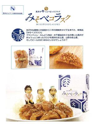 『長井が牛(ぎゅぅ)っとつまったラスク』というタイトルから、みなさんは“何”を想像しますか?『長井』『牛』『ラスク』の3つの言葉が入っていますが、それだけでは“?”ですよね〜(?へ?)ヒントは商品名⇒『みそベコラスク』です♪ここでピン!ときた方もいらっしゃるハズ(*゚-^)bつまり、長井産の商品をそれぞれ使って生まれた新商品なんです!▼こちらが『みそベコラスク』このラスクは、ブランドォレ小松龍侍氏がご友人(米沢牛生産者)との会話がきっかけで生まれました。開発に3年の時間と思い、試行錯誤を重ねた上での登場です!長井の『みそ』は、大千醤油店の山形雪っこみそ(こし)長井の『ベコ』は、えんどう肉店から米沢牛の脂長井の『ラスク』は、ブランドォレのシュークリームの皮商品の発売が決定したので、今回試食会が開催されました!▼新商品の説明左から、大千醤油店さん、えんどう肉店さん、ブランドォレさん気になることは聞いてみよう♪○一番のこだわりは? ・米沢牛の牛脂を使用していること。かなり珍しい商品になるはず。 ☆牛脂を使うことでおいしさ、香り、こくが増すそうです!○何で味噌? ・味噌の9割がみそ汁としてだけ。需要拡大を図る起爆剤になれば… ・ビールにも合う。スイーツを男性にも食べてもらいたい ・今後、味のバリエーションを増やしていけるのでは ☆味噌の味を出すのではなく、旨みの底上げとして練り込んであると!▼わくわく・ドキドキの試食タイム!試食会場にいらっしゃった方々はみなさん真剣そのもの。ビールにも合うとのことで、ノンアルコールビールも準備されていました!「お菓子でもOK、お酒のおつまみとしても合う。」「味噌のしょっぱさ、甘み、とろける牛脂が絶妙なバランス」「シューラスクを米粉では?」などと感想や意見がでました。実際に食べてみました。味噌だからしょっぱいのかな〜と思っていたので、一口目で驚きました!サクサクのラスクにほんのり香る味噌の風味。上品な甘さでやさしい味です(〃〃)気になる、長井が牛(ぎゅぅ)っとつまった『みそベコラスク』は平成24年8月1日(水) 堂々の発売開始です!もちろん、やまがたタス物産館でも販売します♪ぜひ長井の新しい産品・お土産になって欲しいです(*^-^*)*゜?。+*?*゜?。+*?*゜?。+*?*゜?。+*?*゜?。+*?*゜?毎月1日・15日にファン倶楽部会員様へメールマガジンを配信中♪▼お申込はこちらから!▼twitter▼お買物はここ!ネットショップやまがたタス物産館※会員登録してからお買い物するとオトクですよ♪ 新規入会で300pt進呈中です(〃〃)