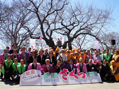 本日、やまがた花回廊のスタートでもある『置賜さくら回廊』のオープニングセレモニーが南陽市の烏帽子山公園で行われました。会場には色とりどりのハッピを着た置賜さくら回廊(南陽・白鷹・長井)2市1町の関係者が集まり、置賜さくら回廊のスタートをお祝いしました!福島県の「福馬」くんもお祝いに(w゚O゚)w長井のバーニックとお友達になれそう♪もしかして兄弟!?えぼし山がお散歩コースの赤湯幼稚園の園児たちがお祝いの歌を♪子ども達の中には震災で避難している子もいるそうなんですが、「さくらがさいたら、あそびにきます!!」と笑顔で元気いっぱい桜を応援してくれました(^-゚*)まだ開花していない置賜さくら回廊の桜達を咲かせようと、花咲かじいさんが登場!「いっぱい来ておごやったがら、咲がさんなね!はなさけ〜!」きっと、あと数日で開花、見事な桜景色を見せてくれるはずです。(木に登ってるのは花咲かじいさんの本家のじっちゃだそう☆)▼今日のえぼし山の桜南陽市は全国有数のぶどう生産量なんです!と、いうことで鏡開きではなく“花咲けカンパイ!”で(*^ー^)/▼☆▼ヽ(^ー^*) チン♪もちろん乾杯は南陽のぶどうでつくられたジュースとワイン“古木”“巨木”“名木”と呼ばれる桜がたくさんある置賜さくら回廊、ぜひ訪れてみてください!それぞれに歴史や見どころ・食べ処があります(*^-^*)▼高台にある烏帽子山から、三体山が見えました!●烏帽子山公園●「さくら名所100選」の1つで、吾妻連峰・飯豊朝日連峰を望む高台の公園。「烏帽子山千本桜」といわれ樹齢百余年のシダレザクラやソメイヨシノ約1,000本が植えられています。全国桜名木二代目園もあります。(長井市の久保桜のニ代目も!)赤湯温泉にも近く、人気のお花見スポットですヽ(*^▽^)ノ+*+*さくら通信 2013*+*+今年も最上川千本桜の様子をお伝えします!花びらのピンクが見えてるつぼみもチラホラでてきました!【ながいファン倶楽部会員募集中!】☆毎月1日・15日にファン倶楽部会員様へメールマガジンを配信♪▼お申込はこちらから!