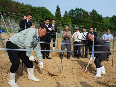 長井市と白鷹町でワイン用のブドウの試験栽培が始まりました!サントリーワインインターナショナル(東京都)と長井市伊佐沢地区と白鷹町萩野地区の農家が連携して栽培を行います(*゚O゚*)耕作放棄地を活用してワイン用ブドウを5年間、試験栽培し実用化を目指すとのこと!▼長井市伊佐沢ではホップ畑だった約16アールをブドウの圃場に!農家5人で組織した「伊佐沢醸造用ブドウ生産組合」(佐藤茂組合長)が高級品種「カベルネ・ソーヴィニヨン」を約440本育てます(*^-^*)▼カベルネ・ソーヴィニヨンの苗3年後には鮮やかな紫色のブドウが生ります!先日27日、良質なブドウが実るよう願いサントリーインターナショナルの桜井社長、内谷長井市長、佐藤組合長、生産農家代表の安部さんによってブドウの苗木の植樹が行わました。願いを込めてしっかりと土をかけます。植えられたブドウを見つめ「おいしいワインを生み出せるよう精いっぱい頑張って栽培します」と佐藤組合長があいさつ。数年後の長井産高級ワイン、楽しみに待ってます(〃〃)きっとうんまいな出来っぺね♪【ながいファン倶楽部会員募集中!】☆毎月1日・15日にファン倶楽部会員様へメールマガジンを配信♪▼お申込はこちらから!