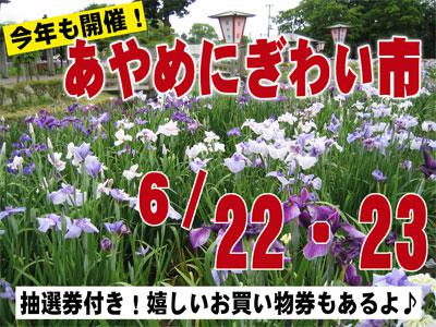 あやめまつりが6月15日〜7月7日までの間、開催されます!期間中はイベントが盛りだくさん♪その中でも目玉イベントが、長井の味覚を満喫できる『あやめにぎわい市』!開催日は 6月22日(土)・23日(日) 9:30〜16:00※お店や商品内容など詳細が分かりましたら、お知らせしたいと思います♪あやめ公園の北側駐車場の特設会場に“長井のうんまいもの”が集まります。さらに特別企画☆の美力アップ「馬肉まつり」も同時開催(*^O^)bこのイベント開催中に使える『抽選権付き!お買い物券』も発売されます!この抽選ではその場でうんまいもの等が当たります!申込書はこちら(PDF)お買物するなら、お買物券を使ってお得で嬉しい抽選を〜!(+゚▽゚)ノ●22、23日頃はあやめが見頃を迎える予想です。そして、總宮神社の黒獅子舞や井上千春あやめライブ、楽しんご・トレンディエンジェル・ペンギンナッツのあやめLove2ショーや企画展・催しが盛りたくさん!!皆さん、花盛りのあやめ公園へ遊びに来てください(*^-^*)【ながいファン倶楽部会員募集中!】☆毎月1日・15日にファン倶楽部会員様へメールマガジンを配信♪▼お申込はこちらから!