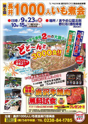 6回目の『長井1000人いも煮会』が9月23日(祝)に開催されます。今年も直径2mの大鍋が登場し、どど〜んと“3000食”作っちゃうそうです!あれ?1000人なのに3000食?? ぁ!美味しすぎておかわり♪ってことかな(*^-^*)▼2mの大鍋 長井のいも煮は“牛肉”“醤油”のの内陸風なのですが、『馬肉の日』が生まれた昨年から“馬肉“入りの“塩味”いも煮も登場!今年も2種類用意されるそう!・牛肉を使った醤油ベースの「極上いも煮」 (昨年のいも煮会の写真です)・馬肉を使った塩ベースの「旨塩いも煮」 (昨年のいも煮会の写真です)どっちも美味しい〜!ウマ〜イいも煮です。ぜひ両方お試しください。 ≪昨年の様子≫あやめ公園北側の河川敷でみんなでワイワイ楽しくいも煮を食べませんか♪イベントや米沢牛焼肉無料試食(先着)もあります(*゚▽^)b[日時]9月23日(祝) 10時〜15時 ※いも煮販売開始は11時30分から[場所]あやめ公園北側 野川河川敷駐車場(雨天決行) 〜いも煮を食べながら 秋の休日を満喫しよう!〜★お得な前売り券も販売中です★ 1枚1,000円(限定500枚) ・いも煮2杯(「極上いも煮」 「旨塩いも煮」 1枚づつ) ・生ビール1杯または、缶ジュース2本 <取扱い先> 長井市観光協会(月〜金)0238-88-5279 鰍、めや本部 0238-84-1785 【ながいファン倶楽部会員募集中!】☆毎月1日・15日にファン倶楽部会員様へメールマガジンを配信♪▼お申込はこちらから!