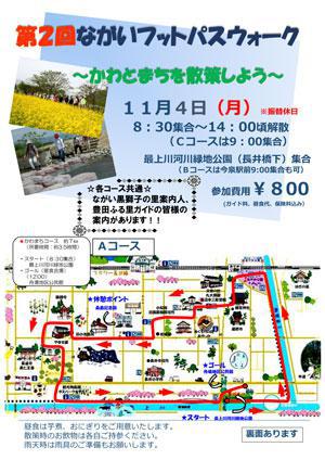 第2回ながいフットパスウォーク〜かわとまちを散策しよう〜長井市内のフットパスコースを歩くイベントが開催されます(*^▽^*)野川沿いを歩くコース八ヶ森を歩くコースなど3コースあり、全コース共に地元のガイドさんのお話を聞きながら散策します!長井の新たな一面を知ることができるかもしれませよ〜♪日時:平成25年11月4日(月) 8:30集合 14:00解散予定集合場所:最上川河川緑地公園参加費:800円<コース> Aコース (かわまちコース) : 約7km 宮、小出地区まちなかめぐり Bコース (とよだコース) : 約8km 豊田地区フットパス Cコース (みやコース) : 約5km 宮地区まちなかめぐり ★詳しくはこちらのチラシ(PDF)をご覧ください★<お申込み方法> 氏名・年齢・性別・住所・電話番号・ご希望のコースを メールまたはお電話、FAXで下記までご連絡ください。 ★申込み締切:10月30日(水) 長井市まち・住まい整備課 〒993-8601 長井市ままの上5番1号 TEL:0238-87-0863(直通) fax:0238-84-5969 E-mail:machisuma@city.nagai.yamagata.jp 【ながいファン倶楽部会員募集中!】☆毎月1日・15日にファン倶楽部会員様へメールマガジンを配信♪▼お申込はこちらから!