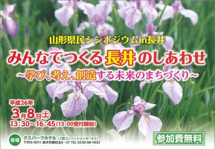 みんなでつくる 長井のしあわせ〜学び、考え、創造する未来のまちづくり〜山形県民シンポジウムが 3月8日(土) 長井市で開催されます!このシンポジウムでは、今後の長井市の発展を担う人材育成の視点から地域連携によるまちづくりやみんなでつくる長井のしあわせについて考える講演とパネルディスカッションが行われます。いつ :平成26年3月8日(土) 13:30〜16:45どこで:タス2階 コンベンションホール <詳しくはこちらをご覧ください(PDF)>▼スケジュールお問合せ:山形大学渉外部渉外課 023-628-4015 長井市企画調整課地域戦略室 0238-87-0817地域を活性化させるためには、若く活力ある人材の活躍が必要なんだそう(*゚O゚)bこれからの長井がもっともっと発展できるよう、素敵な人材がたくさん育つと良いな♪ 【この記事は、ながいファン倶楽部のブログです】 ☆毎月1日・15日にメールマガジンを配信しています♪ ご希望の方は会員登録をお願いします。