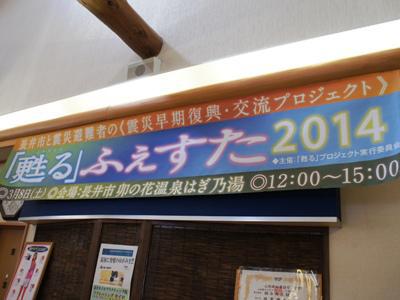 3月8日(土)長井市成田のはぎ乃湯さんを会場に「甦るふぇすた」が開催されました!▼会場のはぎ乃湯時折強く吹雪く荒れ模様でしたが、負けずに到着!会場内は外と打って変わって、暖かく、休憩スペースがイベント会場に様変わり(*^-^)b イベントと知らず訪れた入浴のお客様も参加しながら楽しい時間となりました!▼イベントの様子 ▼「甦る」の酒かすを使った品々!どれもおいしかったです♪ 甦るのイベントのほかに、小桜朝市の春こいバージョンも行われ、賑わっていました!終始、和気あいあいとした雰囲気で、ゆっくり参加してきました(〃〃)明日で東日本大震災から丸3年。1日も早い復興を願っています。※「甦る」のお酒の発売日は、3月11日(明日)です。ご予約いただいております 皆様には明日発送をいたします!【この記事は、ながいファン倶楽部のブログです】▼長井の情報いっぱいのブログは公式サイトから! ☆毎月1日・15日にメールマガジンを配信しています♪ ご希望の方は会員登録をお願いします。 ※ながいファン倶楽部のブログで使用している写真は私たちが一生懸命 撮った写真です。勝手にお使いにならないでくださいね♪