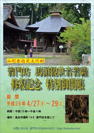 長井市横町にある「普門坊」の馬頭観音様が御開帳されます!60年に一度、「午年」に御開帳される秘仏なのだそう(@@)前回の御開帳は2002年で次の御開帳は2062年なのですが300年ぶりに馬頭観音様の修復が行われたことを記念して午年の2014年、特別に御開帳されることとなったそうです!○御開帳期間 平成26年4月27日(日)〜4月29日(火)○時間 午前10時〜午後4時○場所 普門坊本堂 (長井市横町14−8) お問い合わせ:0238-84-0427 ≪詳しくはこちら(ホームページ)≫馬頭観音様は2メートルを超える大きな仏様とのこと!この機会にぜひ訪れてみてはいかがでしょうか(*^-^*)隣接する遍照寺では、草木供養祭が行われるそうです。【この記事は、ながいファン倶楽部のブログです】▼長井の情報いっぱいのブログは公式サイトから! ☆毎月1日・15日にメールマガジンを配信しています♪ ご希望の方は会員登録をお願いします。