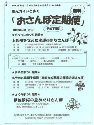 さくらの時期、たくさんご参加いただいた「おさんぽ定期便」、白つつじまつりの期間中も行われています(*^-^*)ちょうど「白つつじ」が見ごろを迎えた今、地元ガイドと一緒にまち歩き、おさんぽしませんか♪▽白つつじとながいファン倶楽部がある「タス」≪詳細≫白つつじまつり期間 まち歩き(最少催行人数:2名)〜上杉藩を支えた水運のまちさんぽ 期 間 : 5月16日(金)〜5月25日(日)※実施日変更あり 受 付 : つつじ館前 所要時間 : 約1時間30分 ○コース→七兵衛つつじ出発〜つつじ館前〜小出舟場〜タス〜 〜二ツ橋〜平野川〜あらまち通り〜齋藤家〜山一醤油〜 〜やませ蔵美術館前解散 お問合せ : ながい黒獅子の里案内人事務局(長井市観光振興課) TEL 0238-87-0827(平日9時〜17時) ▽つつじ公園内マップもつつじ公園にあります♪ ★ながい黒獅子まつりまで あと 3日 !!★ ≪黒獅子まつりの特設ページ!中継もこちらから≫【この記事は、ながいファン倶楽部のブログです】 ☆毎月1日・15日にメールマガジンを配信しています♪ ご希望の方は会員登録をお願いします。 ※ながいファン倶楽部のブログで使用している写真は、私たちが 一生懸命撮った写真です。勝手にお使いにならないでくださいね♪