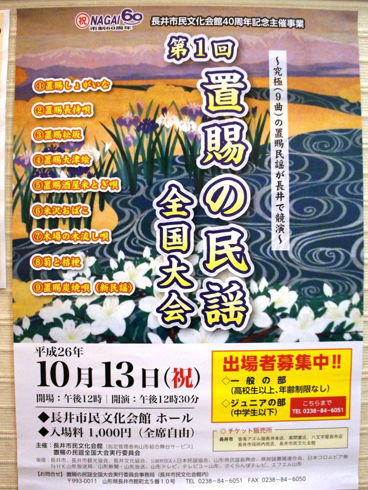 10月13日、第1回置賜の民謡全国大会が行われます!長井市民文化会館40周年記念主催事業として開催され、置賜地方の民謡9曲を選考曲とし、置賜では初!長井市発信の民謡全国です。●開催日:平成26年10月13日(祝) 12:30開演●会場:長井市民文化会館●入場料:1,000円(全席自由)●チケット販売所:音楽アズム館長井本店、風間書店、八文字屋長井店、 長井市役所内売店、長井市民文化会館●ゲスト出演者 ・町田 忠雄 さん ・菅野太郎吉 さん ・井上 千春 さん●他賛助出演:舞踊4団体 宮内民謡研究会・民謡民舞米菊会・高畠伝菊会・侃鶯会舞踊部●お問い合わせ:置賜の民謡全国大会実行委員会事務局(長井市民文化会館内) TEL 0238−84−6051 FAX 0238−84−6050▽置賜の民謡@置賜しょがいなA置賜長持唄B置賜松坂C置賜大津絵D置賜酒屋米とぎ唄E米沢おばこF木場の木流し唄G菊と桔梗H置賜炭焼唄(新民謡)聴くとわかるのかなぁ?曲名では・・・(*〜*;)出場される方、頑張ってください!興味のある方はぜひご来場ください。【この記事は、ながいファン倶楽部のブログです】☆毎月1日・15日にファン倶楽部会員様へメールマガジンを配信♪▼前の記事・会員お申込はこちらから!