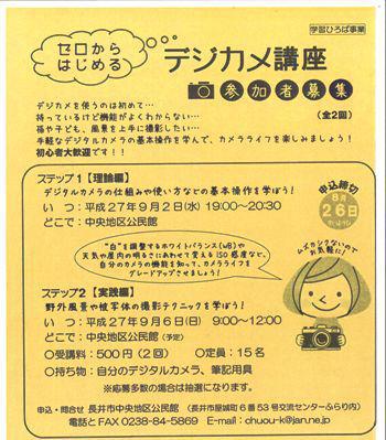 日中はまだ残暑厳しい長井ですが、夏休みも終わり、もうじき秋の行楽シーズンがやって来ますね♪運動会・芋煮会・バーベキューなどなど、楽しいレジャーには思い出を残すためのカメラがつきものです(^O^)/でもせっかく高性能なデジカメを持っていても、使い方や機能を知らないため、残念な写真になってしまう事も・・・(+_+)そんな悩みを一挙解決!「ゼロからはじめるデジカメ講座」が開かれます。ステップ1【理論編】 デジタルカメラの仕組みや使い方の基本操作を学びます。 いつ : 9月2日(水) 19:00〜20:30 どこで : 中央地区公民館ステップ2【実践編】 野外風景や被写体の撮影テクニックを学びます。 いつ : 9月6日(日) 9:00〜12:00 どこで : 中央地区公民館(予定)○ 受講料 : 500円(2回) ○ 定員 : 15人○ 持ち物 : 自分のデジタルカメラ、筆記用具○ お問い合わせは・・・長井市中央地区公民館 TEL/FAX 0238−84−5869基本操作を知って、カメラライフをグレードアップさせませんか?【この記事は、ながいファン倶楽部のブログです】☆毎月1日・15日にファン倶楽部会員様へメールマガジンを配信♪▼お申込はこちらから!