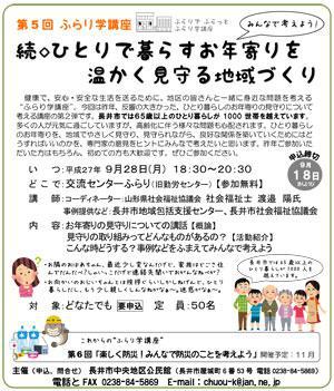 第5回ふらり学講座が開かれます。今回のテーマは、「続 ひとりで暮らすお年寄りを温かく見守る地域づくり」長井市では、65歳以上の一人暮らしが1000世帯を超えました。地域の高齢化は、他人事ではなくなってきていますね。見守る側も、見守られる側も気持ちよくお付き合いしていくには・・・?ご近所付き合いのヒントになるアドバイスを、専門家に伺えます。前回も大反響があったこの講座、是非ご参加ください(^O^)/い つ:平成27年9月28日(月) 18:30〜20:30どこで:交流センターふらり(旧勤労センター)講 師:(コーディネーター)山形県社会福祉協議会 社会福祉士 渡邉 陽さん (事例提供など)長井市地域包括支援センター、長井市社会福祉協議会内 容:お年寄りの見守りについての講話 見守りの取り組みについて【活動紹介】など対 象:どなたでも参加無料【この記事は、ながいファン倶楽部のブログです】☆毎月1日・15日にファン倶楽部会員様へメールマガジンを配信♪▼お申込はこちらから!
