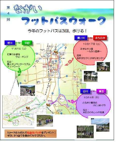 今年で第4回を迎えるフットパスウォークが、リニューアルして開催されます。今回は3日に分けて、それぞれ1コースずつじっくり楽しめます(*^_^*)毎年このイベントを心待ちにしていらっしゃる方々、「日程が合わない」「もっといろんなコースを歩きたい」・・・などの悩みが一挙解決♪是非ご参加くださいね(^O^)/【ふるさと豊田の川と里山めぐり コース】【約7q】白川沿いと豊田の里山を巡るコースです。長井のフットパス発祥の地であり、日本で最も古いフットパスコースのひとつです。北八ヶ森から見る景観はお薦めシャッターポイント♪昼食は地元の人と一緒に食べる山形名物の芋煮。歩いた後に食べる味はまた格別なものです。【日時】平成27年10月4日(日)8:30集合 13:00頃解散予定【集合場所】白川河川敷グラウンド【昼食会場】白川河川敷グラウンドで芋煮とおにぎり【参加費】1,000円(昼食、保険料、ガイド料込)【コース内容】白川グラウンド(集合)→白川フットパス→白川新堤防→最上川ビューポイント→北八ヶ森→河井公民館(休憩)→白川グラウンド(昼食) 【みずはの小道〜もみじ回廊〜 コース】【約5q】最上川沿いとまちなかを巡るコースです。秋色づくまちなかの紅葉を楽しみながら、かつて舟運で栄えた長井の面影を辿ります。今年度国登録有形文化財となった「旧丸中横仲商店蔵群」の見学もコースに含まれていますよ(*^_^*)昼食は一昨年同様舟場地区公民館。参加者の皆さんからのおかわりの声が鳴りやまなかった伝説の芋煮です。【日時】平成27年10月17日(土)9:15集合 14:00頃解散予定【集合場所】長井駅【昼食会場】舟場地区公民館で芋煮とおにぎり【参加費】1,000円(昼食、保険料、ガイド料込)【コース内容】長井駅(集合)→けん玉広場→あらまち国登録有形文化財 「旧丸中横仲商店蔵群」見学→平野川沿い(やませ蔵美術館)→白つつじ公園→小出船着場→最上川フットパス→宮船着場→船場地区公民館(昼食)→長沼酒造(試飲)→小桜館・丸大扇屋→長井駅(解散) 【紅葉の水源地ウォーキング コース】【約6q】野川沿いと平野地区を歩くコースです。野川の豪快な流れと岩肌が特徴の石渕渓谷と西山の美しい紅葉は絶景です。昼食は野川の清流を見ながら食べると更に美味しい”清流弁当”と芋煮。秋深い西山を眺めながら心身ともにリフレッシュするひとときを過ごしませんか。【日時】平成27年11月1日(日)9:15集合 12:20頃解散予定【集合場所】野川まなび館【昼食会場】野川まなび館で清流弁当と芋煮【参加費】1,000円(昼食、保険料、ガイド料込)【コース内容】野川まなび館(集合)→石渕渓谷→三堰合同記念碑→道照寺平スキー場→卯の花姫橋→小水力発電所→野川分水口→平泉橋→木蓮堰→締切堤防→野川まなび館(昼食)【申し込み方法】参加希望のコースと氏名・年齢・性別・住所・電話番号をメールまたはお電話、FAXで下記までご連絡ください。【申込みとお問い合わせ先】 長井市建設課 都市計画係 〒993-8601 長井市ままの上5番1号 TEL:0238-87-0863(直通) fax:0238-84-5969 E-mail:kensetsu@city.nagai.yamagata.jp 申込み締切:各コース開催日の1週間前まで【この記事は、ながいファン倶楽部のブログです】☆毎月1日・15日にファン倶楽部会員様へメールマガジンを配信♪▼お申込はこちらから!