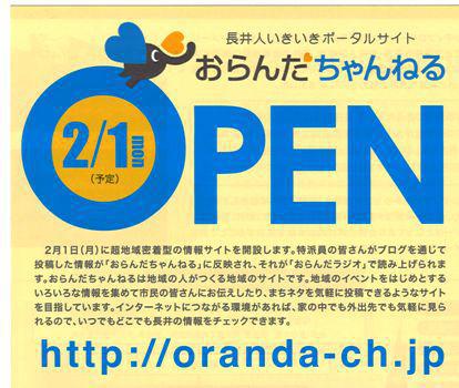 長井FM「おらんだラジオ」は、もう皆さんお聞きになっていますよね。置賜弁バリバリで、隣のおじちゃんやご近所で勃発する小さな事件まで登場する、長井の人々の長井の人々による長井の人々の為のラジオ♪その「おらんだラジオ」に自由に投稿できる情報サイト『おらんだちゃんねる』が2月1日に開設されます(^O^)/パチパチ誰でも気軽に、身の回りの出来事や口コミ情報を投稿でき、それが『おらんだちゃんねる』に反映されます。イベントやまちネタ、その他楽しい話題は「おらんだラジオ」の中で読み上げられる事も(*^_^*)皆さんも是非投稿して、地域を元気にする特派員になりませんか?---申し込み・お問い合わせはこちらまで---ながいシティプロモーション戦略会議(事務局:長井市総合政策課)運営委託:日本・アルカディア・ネットワーク株式会社(TEL:0238-84-5711)【この記事は、ながいファン倶楽部のブログです】☆毎月1日・15日にファン倶楽部会員様へメールマガジンを配信♪▼お申込はこちらから! ※ながいファン倶楽部のブログで使用している写真は、私たちが 一生懸命撮った写真です。勝手にお使いにならないでくださいね♪