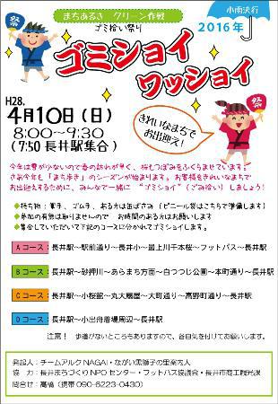 桜の便りが聞こえ始めると、まち歩きのシーズン到来です。長井市内にたくさんの観光客の方がやって来てくれます。お客様をゴミのないきれいな町にお迎えするために、また住んでいる私たちが気持ち良く過ごすために、みんなで一緒に“ゴミショイ”(ゴミ拾い)しましょう!期日:4月10日(日)時間:8:00〜9:30(7:50長井駅集合)◆持ち物:軍手、ある方は缶ばさみ(ビニール袋はこちらで準備します)◆参加の有無はとりませんので お時間のある方はお願いします。◆集合していただいて下記のコースに分かれてゴミショイします。【Aコース】長井駅〜長井小〜最上川千本桜〜タス〜本町商店街〜長井駅【Bコース】長井駅〜あらまち方面〜白つつじ公園〜長井駅【Cコース】長井駅〜小桜館〜丸大扇屋〜總宮神社〜長井駅どのコースも長井駅に7:50まで集合になります。≪問い合わせ≫長井まちづくりNPOセンター (TEL 0238-87-0239)桜とともに清潔で美しい町並みを楽しんでもらいたいですね♪【この記事は、ながいファン倶楽部のブログです】☆毎月1日・15日にファン倶楽部会員様へメールマガジンを配信♪▼お申込はこちらから! ※ながいファン倶楽部のブログで使用している写真は、私たちが 一生懸命撮った写真です。勝手にお使いにならないでくださいね♪