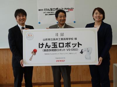 昨年、自動車部品総合メーカー「デンソー」が企画した「けん玉ロボットプロジェクト」に長井工業高校の生徒たちが参加しました。→当時の様子はこちらからアーム型の産業用ロボットにけん玉の技をプログラミングする取り組みに挑戦し、ITとデジタル家電の展示会「CEATEC(シーテック)ジャパン」で披露しました。それがご縁となり、「デンソー」から工業高校へ産業用ロボットが寄贈される事になりました(^O^)/ 目録が贈呈された後、操作の基本手順等を教えてもらい、先輩の志を引き継いだ新3年生の生徒達が実際に端末を使ってロボットを動かしてみる場面も。本年度は希望者10名がプログラミングに取り組むそうです。最先端のロボットを使いこなせる技術者が長井から育ってくれれば素晴らしいですね。【この記事は、ながいファン倶楽部のブログです】☆毎月1日・15日にファン倶楽部会員様へメールマガジンを配信♪▼お申込はこちらから! ※ながいファン倶楽部のブログで使用している写真は、私たちが 一生懸命撮った写真です。勝手にお使いにならないでくださいね♪