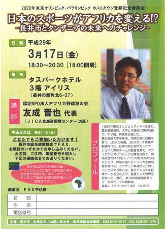 三月に入ったというのに一晩で20cmにもなる積雪に見舞われ、季節が一か月くらいも逆戻りしたような感じです。長井で春を感じるのはもう少し先になりそうですね。さてこの度長井市が、2020年に開催される東京オリンピック・パラリンピックのホストタウンに登録されました。ホストタウンは、オリンピックに参加する世界各国の選手を迎え入れ、「おもてなし」をする役割を担います。長井市はタンザニア連合共和国を相手国として登録されました。これを記念し、現在アフリカと日本を野球でつなぐNPOを立ち上げ活躍されている「友成 晋也氏」をお招きし、お話を伺います。友成氏は、JICA職員としてガーナ・ タンザニア事務所に勤務しながら、両国の野球ナショナルチームの監督を務めていた方。『日本のスポーツがアフリカを変える!? -長井市とタンザニアの未来へのチャレンジ-』講師:認定NPO法人アフリカ野球友の会 代表 友成晋也 氏 ?(JICA北海道国際センター 次長)【日 時】 ?平成29年3月17日 金曜日 18時30分〜20時30分 【会 場】 ?タスビル3階アイリス (長井市館町北6-27)【申込締切】 平成29年3月15日 水曜日地方都市から東京オリンピックの成功を願いつつ、微力ながらもお手伝い出来たら素晴らしいですね。ぜひご参加下さい。【この記事は、ながいファン倶楽部のブログです】☆毎月1日・15日にファン倶楽部会員様へメールマガジンを配信♪▼前の記事・お申込はこちらから!