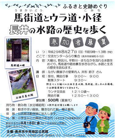 あっという間に7月も終わりに近づき、地元産のスイカも出始めた今日この頃。「水と緑と花の長井」らしくすっかり夏めいたまちなかの、うら道・小径(こみち)を散策してみませんか。〜〜〜 ふるさと史跡めぐり 〜〜〜大樋川、野呂川、平野川、木蓮川…などなど、まちなかを流れる水路をめぐり、馬街道などの歴史の道や路地裏を歩いて、水路と生活の歴史を訪ねます。▼「やませ蔵」脇の水路 清水に映える梅花藻 い つ:平成29年8月27日(日)9:00〜13:00どこで:交流センターふらり集合(屋城町6-53)講 師:ながい黒獅子の里案内人 井形 節子さん参加費:500円(昼食代)持ち物:飲み物(水分補給用)動きやすい服装、履きなれた靴、帽子着用でご参加ください。【申し込み・問い合わせ】長井市中央地区公民館 電話とFAX:0238-84-5869いつも何気なく通り過ぎてしまう見慣れた風景の中に新しい発見がいっぱいの史跡めぐりです。ふるってご参加ください♪【この記事は、ながいファン倶楽部のブログです】☆毎月1日・15日にファン倶楽部会員様へメールマガジンを配信♪▼前の記事・お申込はこちらから!