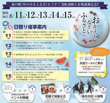 8月に入り、街なかは何となく賑わっているような・・・夏休みを利用して帰省している人が増えているんですね。オープンから4か月経ち、間もなく来場者数300,000人を数えようとしている「道の駅 川のみなと長井」では、楽しいイベントと美味しいもの盛りだくさんで皆様のお越しをお待ちしています。☆ ☆ ☆ 8月11日(金) ☆ ☆ ☆来店記念 ・・・ 300,000人感謝記念切符限定品 先着 300名様プレゼントたけさんの風船パフォーマンス ・・・ 11時・14時 実演冷やし玉こんプレゼント ・・・ 11時から 先着100名様▼シリアルナンバー入りのレアな記念切符(^O^)ぜひゲットしてくださいね。☆ ☆ ☆ 8月12日(土) ☆ ☆ ☆たけさんの風船パフォーマンス ・・・ 11時・14時 実演‹お子様限定› お菓子のすくいどり ・・・ 11時・14時 1回100円各時間先着20名☆ ☆ ☆ 8月13日(日) ☆ ☆ ☆冷やし玉こんプレゼント ・・・ 11時から 先着100名様☆ ☆ ☆ 8月14日(月) ☆ ☆ ☆ポップコーンプレゼント ・・・ 11時・15時 ‹お子様限定› お菓子のすくいどり ・・・ 11時・14時 1回100円各時間先着20名スイカわり大会 ・・・ 13時 うまく割れたらスイカ1個プレゼント☆ ☆ ☆ 8月15日(火) ☆ ☆ ☆ポップコーンプレゼント ・・・ 11時・15時けん玉ペインティング体験会 ・・・ 11時・15時 各時間先着15名(参加費500円)芋煮ふるまい ・・・ 11時30分〜 先着100名様『風花の民』の演舞 ・・・ 13時30分〜 中庭広場にて☆ 11日(金) 〜 15日(火) 地場食品協同組合のテント村開催☆ 10日(木) 〜 9月17日(日) 黒獅子頭展示会田舎の夏の思い出はいつまでも心の中に残るもの。長井で過ごす時間が楽しいものになると良いですね(*^_^*)【この記事は、ながいファン倶楽部のブログです】☆毎月1日・15日にファン倶楽部会員様へメールマガジンを配信♪▼前の記事・お申込はこちらから!