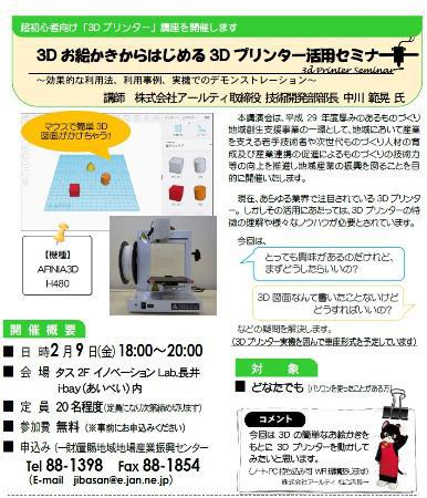 1月10日に『3Dプリンター講習会』が行われたイノベーションLab. 長井i-bay(あいべい)ですが、今度はより初心者向けのセミナーを開催しますヽ(^o^)丿『3Dお絵かきからはじめる 3Dプリンター活用セミナー』日時 : 2月9日(金) 18:00 〜 20:00会場 : タス2F イノベーションLab. 長井i-bay(あいべい)内定員 : 20名程度参加費 : 無料(※事前にお申し込みください)講師 : 株式会社アールティー 取締役 技術開発部部長 中川 範晃氏お申込み・お問い合わせ : (一財)置賜地域地場産業振興センター TEL 88-1398 FAX 88-1854▼3DプリンターAFINIAパソコンを使ったことがある方ならどなたでも参加できます。マウスを使って簡単に3D図面を書き、それを立体に起こしていく遊び心満載のセミナーです。初心者の方もぜひご体験ください。【この記事は、ながいファン倶楽部のブログです】☆毎月1日・15日にファン倶楽部会員様へメールマガジンを配信♪▼前の記事・お申込はこちらから!
