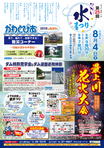 平成30年8月4日(土)は「ながい水まつり&最上川花火大会」!今年でなんと25回目を迎えます。水まつりは、最上川発祥の地である長井で開催される『水』がテーマのイベント。午前9時30分からのオープニングセレモニーを皮切りに水に親しむ様々な体験&イベントがい〜っぱい(*^▽^*)ノ夜には、間近で「ド〜〜ン」とあがる最上川花火大会も必見です♪〜今年のイベント紹介〜☆かわとぴあ 2018 in ながい☆ ・パネル展など...・上下水道展 in 水まつり 「巨大蛇口」「大噴水」「獅子おどし」「上下水道機器の展示」「ゲームコーナー」・ 体験コーナー 「ミニバックホウ操作体験コーナー」「丸太切り体験コーナー」☆南国特産物販売 沖縄県金武町交流物産展☆ 沖縄県のおいしい特産物。毎年マンゴーは即完売商品!☆水の郷ながい 大水合戦☆雪合戦の雪玉の水玉(水風船)を使用する競技です。(当日は参加4チームによるトーナメント戦を実地します。)☆魚つかみどり大会☆ 小学生以下が対象。参加料一人200円。☆「ゆかた」で会場へ来てくださいね☆ 午後5時からは「ゆかた」で♪ 浴衣の似合う女性コンテストも開催!★最上川花火大会★ 打ち上げ開始は午後7時30分から。市民の皆さんへ送る花火ショー! 午後9時終了予定。会場イベント等のため一時中断する場合があります。 ※雨、強風の場合は順延 ※有料席もあります。 お申込み・お問い合わせ:長井市観光協会(TEL0238-88-5279)☆長井ダム特別見学会&湖面巡視体験☆ ・ダム特別見学会 : いつもは行けない所へ案内します。 時間:10:00〜16:00 1回 25名で4回実施予定 (計100人) ・ダム湖面巡視体験 : 2艇の巡視船でながい百秋湖を回ります! 時間:10:10〜16:00 1回 10名で10回実施予定 (計100人) ダムイベントへのお問い合せ:長井ダム管理支所(TEL0238-88-5741)【この記事は、ながいファン倶楽部のブログです】☆毎月1日・15日にファン倶楽部会員様へメールマガジンを配信♪▼前の記事・お申込はこちらから! すべて(