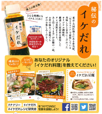 先週末ながい水まつりの日、道の駅に「プレートランチナナリー」さんが出店し、『秘伝のイケだれ』を実演販売しました。炒め物にも、冷奴にも、ドレッシングとして生野菜にも♪幅広く活躍してくれそうな万能調味料がナナリーさんの『イケだれ』。▼ホルモン焼きもイケだれで味付けされると、格別の美味しさ(*^_^*)東京都大田区は、長井市と防災連携協定を結んでいます。地場産の東京事務所も大田区蒲田に。そんなご縁もあって、大田区池上にあるナナリーさんのお弁当には、こだわりの長井産米が使われ、肉料理などはもちろん『秘伝のイケだれ』で味付けされて。♪ ♪ ♪ 『秘伝のイケだれ』 詳しくはこちらから ♪ ♪ ♪道の駅「川のみなと長井」でも数量限定店頭販売しています。これ一本で味が決まる!お弁当のおかず作りにも一役買ってくれそうですね。ぜひお試し下さい。この記事は、ながいファン倶楽部のブログです】☆毎月1日・15日にファン倶楽部会員様へメールマガジンを配信♪▼お申込はこちらから!