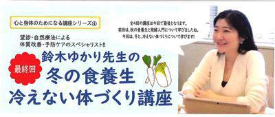 夏と秋2回に渡って心と身体のためになる勉強をしてきた「ゆかり先生の食養生講座」。今回は寒ーい冬に向けた”冷えない体づくり”について教えてくれます。朝晩急速に気温が下がり冷え込む冬は、腎臓や膀胱に負担のかかりやすい時季。一年間頑張ってきた自分の身体を労わりながら、春にまた活動する為のエネルギーを蓄える秘訣を学びましょう。〜〜〜 鈴木ゆかり先生の 『冬の食養生講座』 『冷えない体づくり講座』 〜〜〜日時 : 2018年11月18日(日) 『第1部 : 冬の食養生講座』 10:00〜12:00 『第2部 : 冷えない体づくり講座』 14:00〜16:00会場 : 長井市タスパークホテル 3階 アイリス定員 : 50名参加費 : 無料お問い合わせは : ホリスティックセルフケアおシェアい会 代表 : 峯田 080-6293-2103 holisticselfcare.osheaikai@gmail.comお申込みは : http://kokucheese.com/s/event/index/519060/毎日の生活に取り入れやすく、わかりやすいこの講座を参考にして、山形の長くて寒い冬に備えましょう♪【この記事は、ながいファン倶楽部のブログです】☆毎月1日・15日にファン倶楽部会員様へメールマガジンを配信♪▼前の記事・お申込はこちらから!