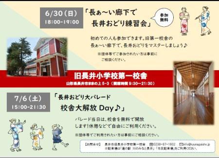 新しく生まれ変わった旧長井小学校第一校舎、先月からご利用可能になり、大好評を博しています(*^_^*)校舎を東西に貫く長〜い廊下を利用して、今年の「長井おどり練習会」が行われることになりました。▼改修された旧校舎 6月30日(日) 18:00−19:00 参加料無料「長ぁ〜い廊下で長井おどり練習会」初めての人も参加できます♪旧第一校舎の長ぁ〜い廊下で長井おどりをマスターしよう!7月6日(土) 15:00−21:30「長井おどり大パレード 校舎大解放Day♪」パレード当日は、校舎を無料で開放します!休憩などでご自由にご利用ください。【お問い合わせ先】長井市旧長井小学校第一校舎TEL/0238-87-1082 MAIL/info@kyunagaisho.jp※駐車場は「道の駅 川のみなと長井」「市民駐車場」をご利用ください。※団体等でご利用されたい方は事前にご相談ください。▼磨き上げられた木造の長い廊下。「あやめまつり」のフィナーレを飾る「長井おどり大パレード」をみんなのパワーで盛り上げていきましょう!ぜひ練習会にご参加ください。【この記事は、ながいファン倶楽部のブログです】☆毎月1日・15日にファン倶楽部会員様へメールマガジンを配信♪▼前の記事・お申込はこちらから!