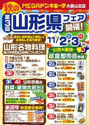 『第3回山形県フェア』が、メガ・ドンキホーテ大森山王店で開催されます。山形の旬の美味しさを産地価格でお届け!〜〜〜 第3回 秋の山形県フェア 〜〜〜日時 : 11月2日(土)・3日(日)場所 : メガ・ドンキホーテ大森山王店1F 2日 11:00 〜 先着50名様に山形名物「いも煮」プレゼント ○ 山形産の新米「雪若丸」 ○ 長井市中川屋の「とら皮まき」 ○ 平野屋の「玉こんにゃく」 の、試食販売会3日 11:00〜 、14:00〜 先着50名様に「玉こんにゃく1串」プレゼント ○ おしどりミルクケーキ ○ 長井中央青果「おみ漬け」 ○ 長井市日進堂の「小桜城(バタークッキー)」 の、試食販売会また、両日とも山形の新鮮野菜・果物・米沢牛を大放出!!お近くにお住まいの方、どうぞ覗いてみて下さいね(*^_^*)【この記事は、ながいファン倶楽部のブログです】☆毎月1日・15日にファン倶楽部会員様へメールマガジンを配信♪▼前の記事・お申込はこちらから!
