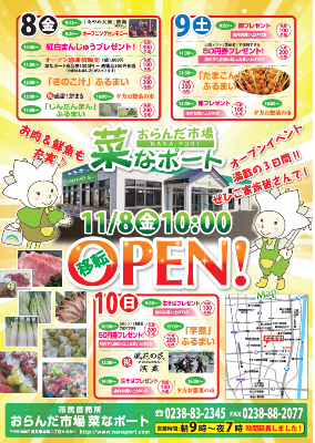 新鮮お野菜の直売所「おらんだ市場菜なポート」が本町(旧ヨーク址)へと移転し、もうすぐオープンを迎えます(^O^)/開店から3日間は特別サービスデー。ぜひお越しください!〜〜〜 おらんだ市場菜なポート 移転OPENイベントスケジュール 〜〜〜11月8日(金) 9:15〜 「あやめ太鼓」披露(雨天中止) 9:30〜 オープニングセレモニー 10:00〜 紅白まんじゅうプレゼント(先着300名) 11:00〜 オープン感謝福袋販売(先着100名) 12:00〜 「きのこ汁」振る舞い(先着200名) 13:00〜 感謝!餅まき 16:00〜 夕方お惣菜の市 17:00〜 「じんだんまん」振る舞い(先着200名)11月9日(土) 9:00〜 「卵」プレゼント(店内お買い上げの方・先着100名) 11:00〜 50円券プレゼント (店内1,000円以上お買い上げの方、出店テントで使用可・先着200名) 12:00〜 「玉こん」振る舞い(先着200名) 14:00〜 「卵」プレゼント(店内お買い上げの方・先着100名) 16:00〜 夕方お惣菜の市 11月10日(日) 9:00〜 「生そば」プレゼント(店内お買い上げの方・先着100名) 10:00〜 50円券プレゼント (店内1,000円以上お買い上げの方、出店テントで使用可・先着200名) 12:00〜 「芋煮」振る舞い(先着200名) 13:00〜 「風花の民」演舞 14:00〜 「生そば」プレゼント(店内お買い上げの方・先着100名) 16:00〜 夕方お惣菜の市♪ 営業時間も延長!!朝9時から夕方7時までになります ♪これからも今まで同様よろしくお願いいたしますm(__)m【この記事は、ながいファン倶楽部のブログです】☆毎月1日・15日にファン倶楽部会員様へメールマガジンを配信♪▼前の記事・お申込はこちらから!