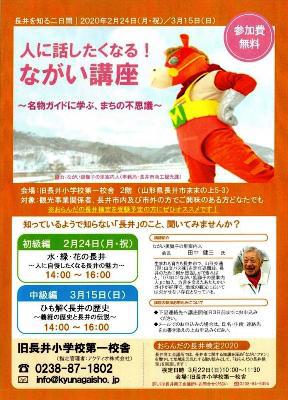 人に話したくなる!ながい講座 〜名物ガイドに学ぶ、まちの不思議〜知っているようで知らない「長井」のこと、聞いてみませんか?■中級編 3月15日(日)14:00〜16:00 (初級編は終了しました) ひも解く長井の歴史 〜義経の歴史と長井の伝説〜※講座参加希望の方は下記の連絡先(旧長井小学校第一校舎)へ講座開催日3日前までにお申し込み下さい。※メールでお申し込みの場合は、氏名・住所・連絡先をお書き添えの上お申し込み下さい。-----------------------------------------学んだ内容で力試しはいかがですか??先日当ブログで紹介している「おらんだの長井検定」もぜひご受験ください!■検定日時 3/22(日)10:00〜11:30■会場 長井市旧長井小学校第一校舎※詳しくは長井商工会議所(0238−84−5394)*お車でお越しの際は、「長井市民駐車場」、「川のみなと長井」の駐車場をご利用ください。 開催日 2020年3月15日(日) 14:00〜16:00 開催場所 長井市旧長井小学校第一校舎 長井市ままの上5番3号 イベントの公式URL(PC) https://kyunagaisho.jp/info/#list2 お問い合わせ先 長井市旧長井小学校第一校舎 TEL:0238-87-1802 info@kyunagaisho.jp Fax:0238-87-1803 開館時間 9:30〜21:30 毎週月曜日・休館(祝日の場合、翌日が休館日となります) 【この記事は、ながいファン倶楽部のブログです】☆毎月1日・15日にファン倶楽部会員様へメールマガジンを配信♪▼前の記事・お申込はこちらから!