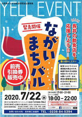 梅雨ど真ん中の長井市。降ったりやんだり、曇天が広がっています。5月5日以降59日間連続新型コロナウイルス感染者の確認がない山形県、市でも少しずつ小さなイベントが企画され始めています。『ながいまちバル』は、チケット制の飲み歩き・食べ歩きイベント。ここ数年の開催でファンも増加中(*´ω`*)食べて・飲んで長井の飲食店を応援しましょう!!〜〜〜 ながいまちバル 〜〜〜開催日時 : 2020年7月22日(水) 18:00 〜 22:00受付時間 : 17:00 〜 21:00受付会場 : 本町テナントミックス施設[cross-ba]前売り引換券 : 4店舗分の飲食券 2,500円(当日券は3,000円)前売り引換券取扱 : 〇長井商工会議所(9時〜17時 月曜〜金曜) 〇道の駅「川のみなと長井」観光案内所 (9時〜18時 年中無休)※今後の状況により、内容の変更や中止になる可能性があります。【この記事は、ながいファン倶楽部のブログです】☆毎月1日・15日にファン倶楽部会員様へメールマガジンを配信♪▼お申込はこちらから!