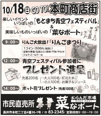 先日も当ブログで紹介した「もとまち青空フェスティバル2020」に直売所「菜なポート」もコラボ参加することになりました〜( *´艸`)※県内在住者のみ参加できます。マスク着用などの感染対策にご協力ください。▼おらんだ市場「菜なポート」は、大人気の新鮮お野菜直売所。〜〜〜 GO TO! 本町商店街 〜〜〜いつ : 10月18日(日) どこで: おらんだ市場「菜なポート」 9:00〜 りんごまつり(1コインでりんご大放出) 12:00〜 青空フェス参加者にプレゼント 大人100名 紅花たまご 小人100名 お菓子&ジュース 14:00〜ポット花プレゼント(先着100名)※当日、青空フェス会場で参加受付してからご来店くださいませ。 【この記事は、ながいファン倶楽部のブログです】☆毎月1日・15日にファン倶楽部会員様へメールマガジンを配信♪▼お申込はこちらから!