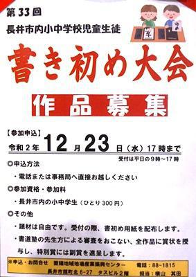 コロナ禍で、一堂に会することが難しい年明け、第33回「新春書き初め大会」は作品提出という形で開催させていただきます〜〜〜 第33回長井市内小中学校児童生徒「書き初め大会」〜〜〜〇 申込方法 ・電話または事務局へ直接お申込みください。〇 申込み締め切り ・令和2年 12月23日(水) 17時まで〇 参加資格・参加料 ・長井市内の小中学生(一人300円)〇 その他 ・題材は自由です。受付の際、書初め用紙を配布します。 ・書道塾の先生方による審査をおこない、全作品に賞状を 授与し、特別賞には副賞を進呈します。〇 お問い合わせ (一財)置賜地域地場産業振興センター 電話:88-1815 担当:横山▼昨年のようす令和3年はお家で単独集中!ぜひご参加ください(●´ω`●)【この記事は、ながいファン倶楽部のブログです】☆毎月1日・15日にファン倶楽部会員様へメールマガジンを配信♪▼お申込はこちらから!