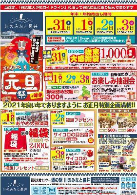外出自粛が予想される令和3年のお正月(*´з`)せめて初売りは・・・とご来店下さったお客様に喜んでいただけますよう、様々なお楽しみを準備しております(●´ω`●)〜〜〜 かわべリング元旦祭 〜〜〜〇 12月31日(木) 13:00〜 『歳末大感謝袋』販売(限定50袋・一家族様1個限り) 商品券2000円+うまいもの(1000円相当)が入って1,000円で販売!〇 1月1日(金・祝) 10:00〜 あやめ太鼓演舞 10:15〜 『新春福袋』販売(限定100袋・一家族様1個限り) 商品券2000円+地元のお菓子(2000円相当)が入って 2,000円で販売! 11:00〜 『福餅』プレゼント(先着100名様) 『お楽しみ抽選会』(お買い物レシート2,000円ごとに1回抽選)〇 11月2日(土) 10:00〜 『福餅』プレゼント(先着100名様) 11:00〜 『お楽しみ抽選会』(お買い物レシート2,000円ごとに1回抽選) 13:00〜 『サイコロゲーム』お子様限定・参加無料(先着30名) 出た目の数だけジュースプレゼント〇 1月3日(日) 11:00〜 『お楽しみ抽選会』(お買い物レシート2,000円ごとに1回抽選) 13:30〜 『サイコロの目出度い』(当日レシート1,000円で1回挑戦) 出た目のか数に応じて卵をプレゼントその他1日〜3日共通で「野菜詰め放題」なども(=゚ω゚)ノ万全の感染症対策のもと、ぜひぜひお越しくださいませ♪【この記事は、ながいファン倶楽部のブログです】☆毎月1日・15日にファン倶楽部会員様へメールマガジンを配信♪▼お申込はこちらから!