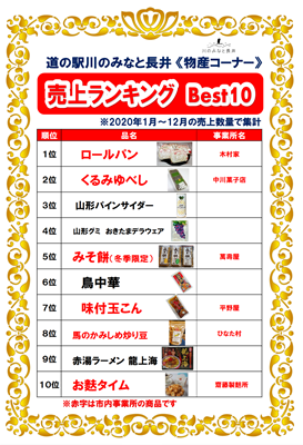 今年もでました!道の駅『川のみなと長井』昨年の売上ランキング^_^«2020年»の売上ベスト1位〜10位をご紹介します(^∀^)/第1位 ☆ ロールパン ☆ <木村家本店>・特製のバタークリームとふわっとした生地。昔から長井で愛され続けてきた懐かしい味。巻いたまんま30pもあるなが〜いロールパンも。(オンラインショップからお求めいただけます)第2位 ☆ くるみゆべし ☆ <中川屋菓子店>・甘いもの好きにはたまらない。もちもちとした変わらない美味しさ。たっぷり入ったくるみの食感も絶妙。(店頭にてお求めください)第3位 山形パインサイダー第4位 山形グミ おきたまデラウエア第5位 ☆ みそ餅(冬季限定) ☆ <萬壽屋>第6位 鳥中華第7位 ☆ 味付け玉こん ☆ <平野屋>第8位 ☆ 馬のかみしめ炒り豆 ☆ <ひなた村>第9位 龍上海ラーメン第10位 ☆ お麩タイム ☆ <板垣製麩所>ベスト10の一覧表は店内にも掲載してあります!道の駅『川のみなと長井』にご来店の際はぜひご覧になって、人気の商品を探してみてくださいね(*^_^*)道の駅 「川のみなと長井」オンラインショップ【この記事は、ながいファン倶楽部のブログです】☆毎月1日・15日にファン倶楽部会員様へメールマガジンを配信♪▼前の記事・お申込はこちらから!