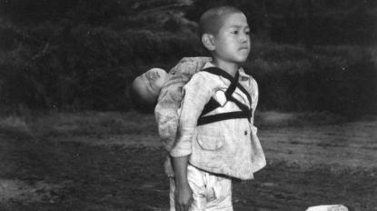 「10歳ぐらいの少年が、歩いてくるのが目に留まりました。おんぶひもをたすきにかけて、幼子を背中に背負っています。少年は、焼き場のふちまで来ると、硬い表情で、目を凝らして立ち尽くしています。背中の赤ん坊は、ぐっすり眠っているのか、首を後ろにのけぞらせたままです。少年は焼き場のふちに、5分か10分、立っていたでしょうか。白いマスクの男達がおもむろに近づき、ゆっくりとおんぶひもを解き始めました。この時私は、背中の幼子が既に死んでいる事に、初めて気付いたのです」