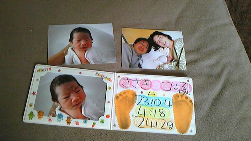 ただの写真ではなく、いつ取ったのか生まれてすぐの小春の足型付きの手作りアルバムまで!立ち会ってくれた助産師さんのメッセージ付きでした。