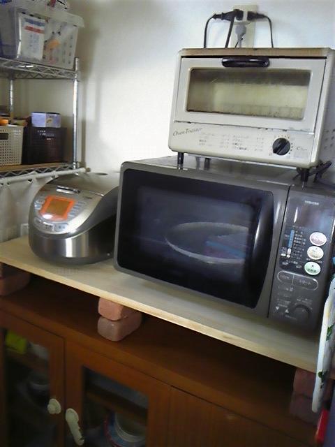まず、収納を増やすために食器棚の上に板とレンガで一段作ってその上に家電をまとめてみました☆