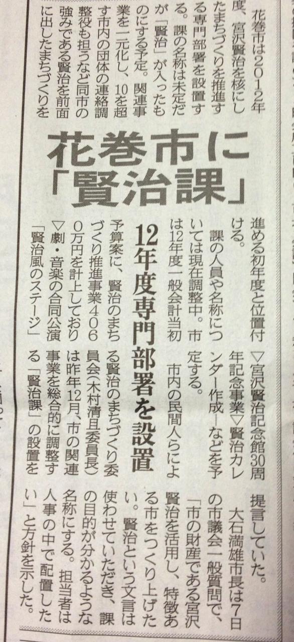 日本全国の市町村、探せば色々とユニークな部署があると思いますが、いわて花巻にも「賢治課」ができるそうです(^∇^)
