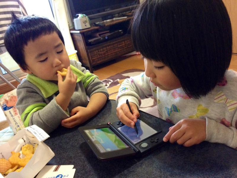 父ちゃんが先日奮発して購入したニンテンドー3DS【シアトリズムファイナルファンタジー】を楽しむカエデと、ムシャムシャお菓子を食いながらそれを眺めるソラ。