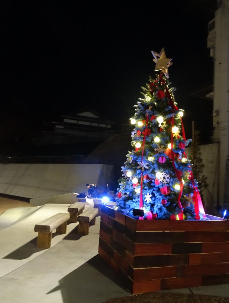 ポツンと点灯するツリ−の頭上には廃屋となった旧料亭「まん福」の広大な建物が…。まさに”怪談”にふさわしいロケーションである=12月9日午後10すぎ、花巻市吹張町で