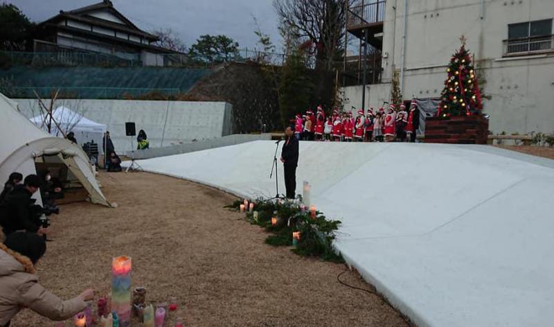オープン式典で肩をすぼめながら、あいさつする上田東一市長。師走入りしたこの日、寒さが一気に強まった。聖歌隊も参加者もお疲れさま=12月1日、フェイスブック上に投稿された写真から