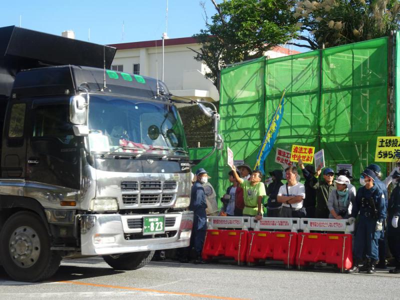 反対コールの中、次々に土砂を基地内に運び込む大型ダンプカ−=2019年7月27日、キャンプ・シュワブのゲート前で