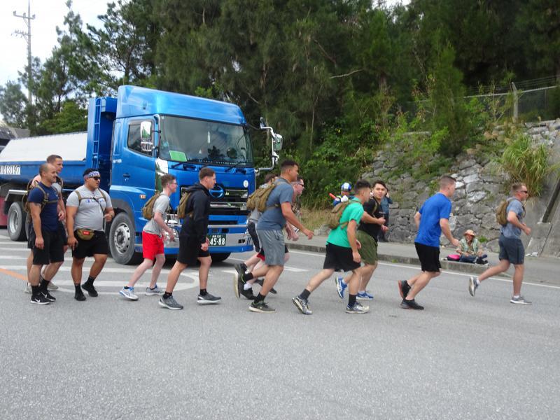 抗議行動をよそに基地外に出かける米海兵隊員=同日午後、キャンプ・シュワブ前で