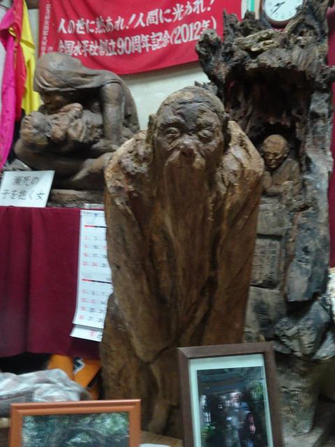 今回の「旅の終わり」はまさに突然、訪れたのだった。1月10日未明の午前2時ごろ、以前から私の沖縄訪問の際に“杖”となり、“足”となってくれていたUさんが同宿したマンスリ−マンションの浴槽で倒れているのを発見した。4年前に千葉県から沖縄に移住し、私のような不案内な旅行者を観光地ではない、たとえば沖縄戦の戦跡や米軍基地の現状を肌で知ることができる現場へと解説付きで連れて行ってくれた。亡き妻をこうした場所に案内してくれたのもこの人だった。本土から訪れる人たちを乗せる「辺野古バス」の運行の手助けをしたり、かと思えば、反対派の拠点テントの中で大鍋にカレ−を仕込んでいる姿も目撃している。 幸い、一命は取り留めたものの、いまも那覇に近い病院で治療を続けている。沖縄と本土をつなぐ最前線にはUさんのように、文字通り“架け橋”に徹する人たちがいる。Uさんとの出会いがなければ、沖縄の記憶を辿りたいという私の数度にわたる「沖縄訪問」も実現していなかったかもしれない。まだ、58歳。一進一退の容態を気遣いつつ、同行者としての責任を感じる日々…… Uさんの身の上に起こった突然のアクシデントが30年も前の、もうひとつの「旅の終わり」の記憶を呼び覚ましたようだった。北海道勤務を終えて東京本社に転勤する際、私は当時流行(はやって)いた演歌「旅の終わりに」(冠二郎)の一節を挨拶状の冒頭にしたためた。赤面するようなキザな文章だが、現代ニッポンを照射しているという意味ではそれほど的外れではないような気もする。恥のかき捨てついでにその要旨を以下に― ●「春にそむいて/世間にすねて/ひとり行くのも/男のこころ…」―。吹雪が舞う北の街で、この唄を口ずさむのが好きでした。報道部有志が送別会を催してくれた翌日、残雪の山並みを眼下に見ながら、五木寛之の同じ題名の文庫本を読みふけっていました。『旅の終わりに』。津軽海峡をひとまたぎした飛行機はあっという間に「トウキョウ」に到着していました。この世界に足を踏み入れて25年。水俣病や被差別部落、そして筑豊…。中央から切り捨てられていく姿を長い間、見続けました。途中、少し寄り道をして北海道へ。ここでもまた、炭鉱閉山や農漁業の衰退、和人の侵略にさらされ続けるアイヌ民族の苦悩を知りました。そしていま、25年ぶりにトウキョウの地に立っています。 ●地下鉄の中で分厚い本を手にした若い女性を見かけました。題名をのぞいて、ぎょっとしました。『常勝思考』。捨て石の山が地方に築かれている間に、中央は勝つことだけに熱中していたのでした。言葉の片鱗として「上昇志向」という程度の記憶しかない浦島太郎にとっては驚くべき出来事でした。「はじまり」があるから「終わり」もあります。南と北の「目」を大事にしたいと思っています(1990年4月の転勤挨拶状から) 沖縄訪問の際、避けて通ることが許されない“関所”がある。「風貌からして叛逆老人。白いあご髭を長く垂らして、手を振って熱弁をふるう」(鎌田慧著『叛逆老人は死なず』)と紹介されている彫刻家の金城実さん(81)である。実は最初に金城さんに引き合わせてくれたのもUさんだった。「関所に立ち寄ってから、田舎に戻ります。早く元気になってまた、水先案内になってください」―。病室に見舞うとUさんは混濁する意識の中で、かすかにうなずいたようだった。うしろ髪がひかれる思いで、病院をあとにした。 「うしろに回ってよく見てみろ」と金城さんがうす暗いアトリエの中で言った。最新作の木彫の背後に「Home−Less」(ホ−ムレス)と刻んであった。「本土に打ち捨てられた沖縄の現実を描きたかったんだよ」と金城さん。「叛逆老人の全国ネットワ−クっていうのはどうですか。南と北から“中央”をにらみ返すんですよ。オジィこそがその代表格にぴったりだと思うんです」と誘惑すると、まんざらでもないような表情で自慢のヒゲをなでまわした。この報告を閉じるに当たって、記録作家・故上野英信さんの“遺言状”(1月23日付当ブログ)について、「筑豊」を「沖縄」に置き換えた浅慮(せんりょ)を反省したい。前者の捨て石の上にいまさらに「後者」の捨て石が築かれようとしているという意味では、両者は並立でなければならない。そして、さらにつけ加えるとすれば、北のアイヌ民族の受難も… 筑豊よ、沖縄よ、アイヌよ日本を根底から変革する、エネルギ−のルツボであれ火床であれ 自前の「背もたれ」を探し求める今回の旅は道半ばで終わった。しかし、この「終わりなき旅」はUさんに背中を押されるようにして、ふたたび再開されると私は確信している。二人三脚の旅を支えてくれたUさんへの心からの感謝と一日も早いカムバックを祈りつつ…… (写真は流木などを拾い集めて、ノミを振るう金城さん。”叛逆老人”の作品にはなぜか「鬼」を題材にしたものが多い=インターネット上に公開された写真より)