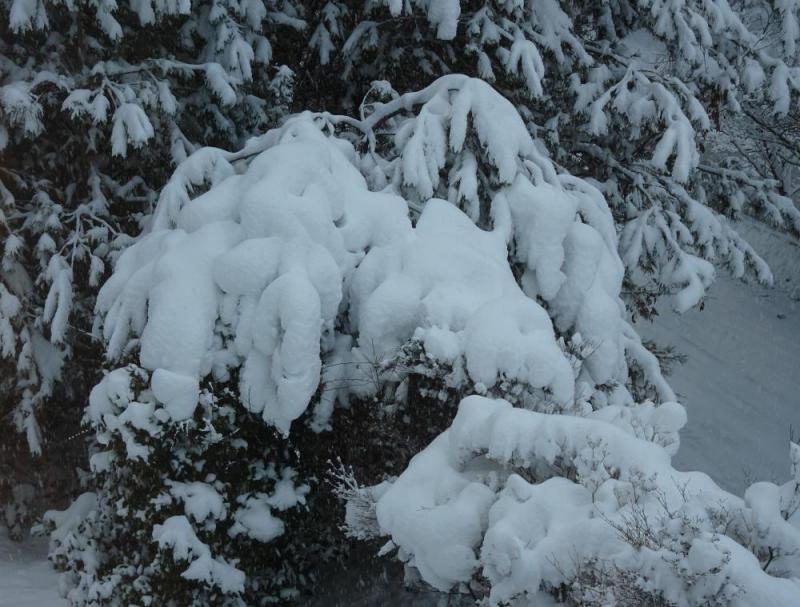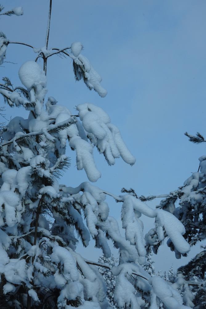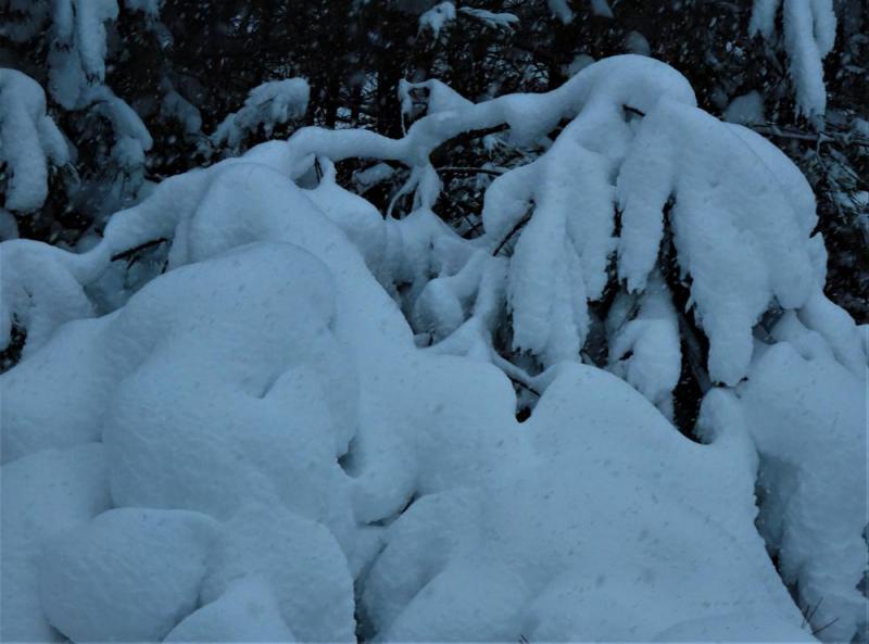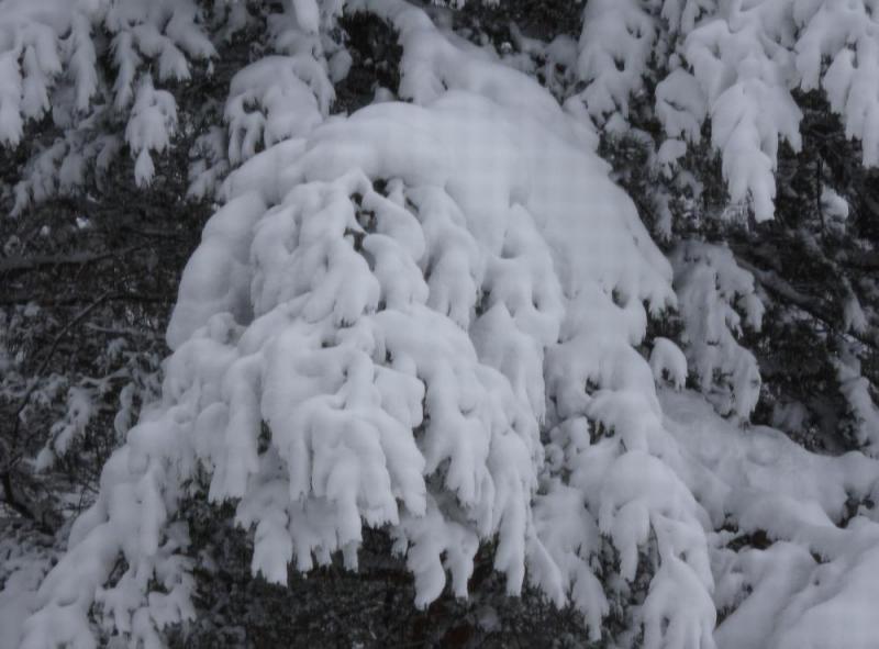 自室から降り積む雪をぼんやりと眺めていると、今度は”雪っ子”たちがまるで息絶えたかのように木にしがみついているようにに見えるではないか。「造化(ぞうか)の妙」ともいえるが、あの恐ろし気な芝居『雪之丞変化』を想起させる光景でもある=12月16日午前11時すぎ、花巻市石鳥谷町の仕事部屋の自室から)