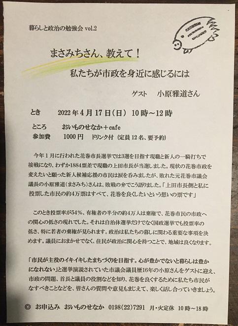 花巻市内でフェアトレ−ド商品などの販売を手がける「おいものせなか」(新田史実子代表)が主催する「暮らしと政治の勉強会」―Vol・2が17日に開かれる(4月1日付当ブログ「追記―2」で一部既報)。今回のゲストスピ−カ−は先の市長選を戦った前花巻市議会議長の小原雅道さん。この勉強会は新旧の一騎打ちになった選挙戦にもかかわらず、投票率が極端に低かったことに危機感を抱いた新田代表らが「さらば!おまかせ民主主義」を掲げて、スタートさせた。 次期市議選は7月17日告示で、同24日投開票。定数26に対し、すでに新人候補が名乗りを上げるなど選挙モ−ドが高まりつつある。議長経験が7年以上の小原さんがし烈な市長選の総括を含めた市政課題について話す予定で、新田さんは「これを機会に市民の皆さんの関心が少しでも高まってくれれば…」と言っている。 (写真はおいものブログに掲載された案内チラシ)