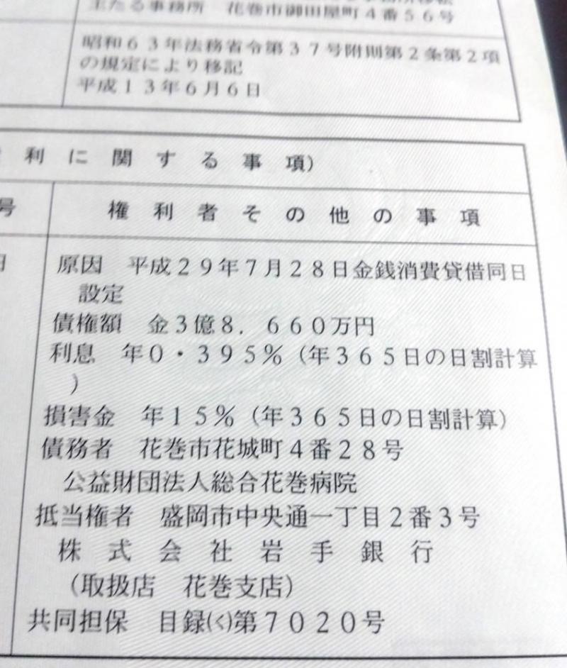 「土壌汚染調査・汚染除去を実施し土壌汚染、廃棄物の残置等及び地上権、抵当権等権利制限のない状態とする」―。花巻市がHP上に公開している「総合花巻病院の移転整備に関する協定」(平成29年3月6日付)には病院側の「敷地譲渡」の前提として、こう明記されている。ところが、「花巻市財産評価審議会」(今月1日開催)に諮問―答申された段階では今回の売買対象となった当該物件には抵当権が設定されたままの状態であったことが土地登記簿から明らかになった。債権額は今回の取得価格を上回る3億8,660万円で、抵当権者は岩手銀行花巻支店となっている。 一方で、今回の病院跡地の正式な市有地化をきっかけに、かけがいのないこの“遺産”こそが、図書館立地の最適地だという機運がさらに高まりそうだ。旧総合花巻病院がオ−プンしたのは大正12(1923)年11月。宮沢賢治の主治医だった故佐藤隆房医師が地域医療の充実を目的に私財を投げうって、設立した。以来当地の中心的な医療機関としての重要な役割を担ってきた。病院の中庭にかつて「Fantasia of Beethoven」と名づけられた花壇があった。賢治自らが設計した花壇の復元で、その時の気持ちをこう書き残している。「けだし音楽を図形に直すことは自由であるし、おれはそこへ花でBeethovenのFantasyを描くこともできる」(『花壇工作』)― 「白雪をいただいた早池峰山がキラキラと輝いていた。その神々しさに思わず、頭(こうべ)を垂れた。足元の跡地にはかつて、賢治が教鞭を取った稗貫農学校(現花巻農学校)が建っていた。そして、シニアのまなび場である『まなび学園』は賢治の妹トシが学び、のちに兄と同じように教師として教壇に立った花巻高等女学校(現花巻南校)。まるで、賢治やトシからここに図書館を作ってと言われているみたいで…」―。2020年3月、新病院の移転・新築に伴って、100年間もの間、巨大な病棟群に目をさえぎられてきた先にこつ然と姿を現した光景…。瀧成子さんはその時の感動をこう、語っている。 他方で、新図書館の立地場所について市側は当初、「花巻市立地適正化計画」(平成28年6月)の中で、「(旧病院跡地を含む)生涯学園都市会館(まなび学園)周辺」と明記していた。ところが、上田東一市長が新たな候補地として「駅前」立地を表明したのは、立地適正化計画の公表から6年たった令和4年9月の市議会定例会の場だった。まさに、その計画変更に待ったをかけるようなタイミングで、目の先に浮かび上がったのが霊峰・早池峰山の雄姿だった。“跡地”コールがあちこちで巻き起こった 瀧さんらが「イーハトーブ図書館をつくる会」を立ち上げたのは昨年1月。他の市民運動2団体も加わり、病院跡地への立地を求める全国規模の署名運動を展開し、現在も続けられている。長い歴史を誇る、新旧「病院」物語が今後、どんな筋書きを描くのか―目を離せなくなってきた。「Fantasia of Beethoven」が図書館入り口にふたたび、復元・再現されることを願いつつ… (写真は抵当権が設定されたままの登記簿)