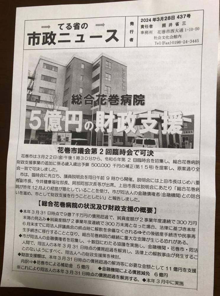 今月22日の花巻市議会臨時議会に先立つ議員説明会が「非公開」になったことについては26日付当ブログ(追記)で触れたが、その内容がひとりの議員の議会報告「てる省の市政ニュース」で明らかにされた。当局側の”秘密主義”に抵抗する形で、市民に対して情報公開してくれたことをありがたく思う。社民クラブ(社民党系=3人)に所属する照井省三議員で、案件となった総合花巻病院に対する財政支援の資料や質疑などが詳しく掲載されている(コメント欄に裏面) これを見ると、病院側の経営状況が予想以上に悪化していることが分かる。このため、当局側が市民感情に配慮して「非公開」にしたものと思われる。しかし、市政運営はあくまで、市民に開かれたものでなければならない。とりわけ、予算(税金)をめぐる審議にはその”負の部分”を含めた透明性こそが求められる。取材陣も締め出すという異常事態に上田「強権」支配―ここに極まれりといった感がある。 ところで、照井議員は上田東一市長の後援会事務局長の肩書も持っている。「あら不思議」と思ったのは、その肩書の所以(ゆえん)である。もしかして、ご乱心の殿に対する”反旗”!?とりあえず、密室政治の一端を垣間見せてくれたことには謝々。とはいえ、市民参画を声高に叫ぶ議会側が「非公開」の軍門に下ったとすれば……市民に背を向けたという意味でことは重大である。非公開の「是非」論争につながることを願いたい。 《追記ー1》〜「記者の目」の鋭い視点 今回の総合花巻病院への財政支援について、岩手日報花巻支局の山本直樹記者がコラム「記者の目」(3月29日付)で、当局側の議会無視の姿勢を厳しく批判した。ということは「無視された」議会側のあり方にも一石を投じたということである。つまり、「二元代表制」の危機に対する警告でもある。以下にその部分を転載させていただく。※ 「…急転直下の臨時議会前、内容が告知されないまま開かれた市議会議員説明会は非公開。密室で議論がほぼ尽くされたのか、その後の議会は、淡々とした説明になった。24年度は、長年懸案とされてきた新図書館建設候補地の選考について重要局面を迎える。今回の市当局の対応は、市政課題への姿勢に疑問を残した。財源を生かした大胆な政策は必要だが、市民への説明責任を怠ってはならない」 《追記―2》〜議員説明会の文書開示を請求 本日(29日)付で、総合花巻病院に対する財政支援に関わる議員説明会(3月22日開催)に提出された説明資料と会議録の写し。「非公開」という理由で文書開示ができないという場合は、その「非公開」の理由と「公開ー非公開」の基準の根拠の明示を求める―という内容の行政文書開示請求を当局側に提出した。 《追記―3》〜花巻市議会基本条例(平成22年6月制定)をおさらいしよう (議会の活動原則=第4条)1、議会は、市政の監視及び評価並びに政策立案及び政策提言を行う機能が十分発揮 できるよう、円滑かつ効率的な運営に努めなければならない。2 、議会は、公正性及び透明性を確保し、市民に開かれた運営に努めなければならない。3、 議会は、市民の多様な意見を的確に把握し、市政に反映させるための運営に努めなければならない。 (議員の活動原則=第5条)1、議員は、議会が言論の場であること及び合議制の機関であることを認識し、議員相互間の自由な討議を尊重しなければならない。2、 議員は、市政全般についての課題及び市民の意見、要望等を的確に把握するとともに、 自己の能力を高める不断の研さんに努め、市民の代表としての自覚を持って活動をしなければならない。3、 議員は、議会の構成員として、市民全体の福祉の向上を目指して活動しなければなら ない。 《追記―4》〜花巻市議会議員政治倫理要綱(平成26年3月告示)をおさらいしよう (政治倫理基準=第3条)議員は、次に掲げる政治倫理基準を遵守しなければならない。 (1) 市民の代表者として、その品位と名誉を損なう一切の行為を慎み、その職務に関し不正の疑惑をもたれるおそれのある行為をしないこと。(2) 市民の代表者として、常にその人格と倫理の向上に努め、その権限又は地位を利用して、不正に影響力を行使し、又は金品を授受しないこと。 2 議員は、政治倫理基準に反する事実があるとの疑惑をもたれたときは、自ら誠実な態度をもって疑惑の解明に当たるとともに、その責任を明らかにしなければならない