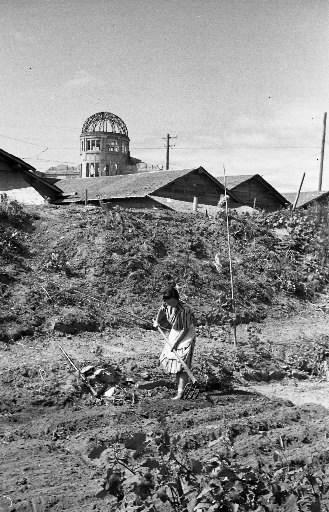 菊池氏が撮影した被爆地・広島の貴重な一枚。後に広島市民球場となる練兵場跡で畑を耕す女性。後方に見えるのが「引揚者住宅」と原爆ドーム。撮影年月日は1947年夏とされる(インターネット上に公開の写真から)