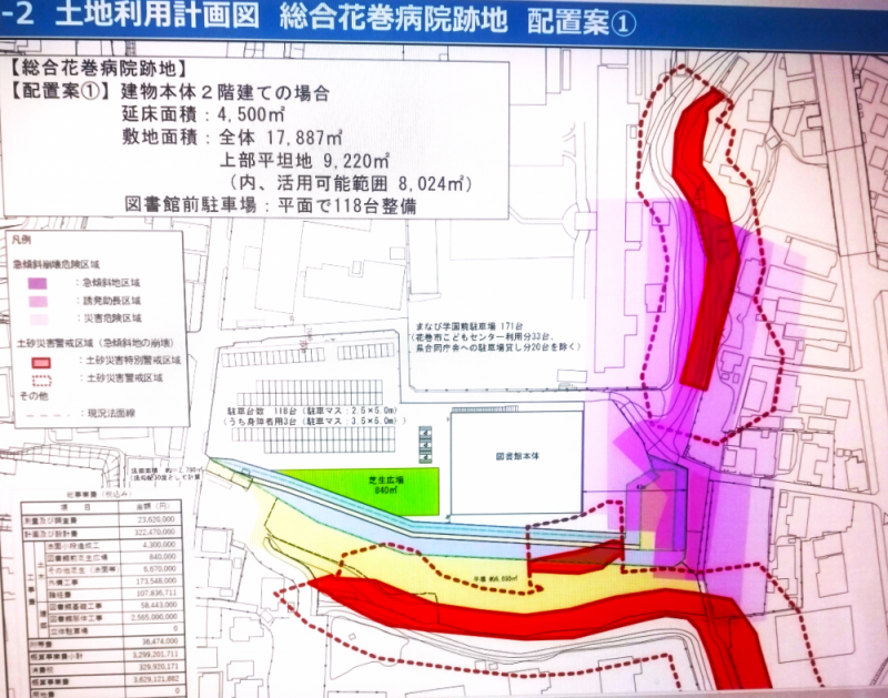 「駅前か病院跡地か」―。新花巻図書館の立地場所を決める際の基礎資料となる「図書館建設候補地」比較調査業務委託の報告書が10日開催の市民説明会で公開された。10年以上の迷走を続けた結果、今月17日から始まる「対話型市民会議」で立地場所の選定に向け、最終的に動き出すことになった。報告書によると、概算の総事業費は駅前案が約39億9千万円で、跡地案は約36億3千万円。国の補助金15億円と合併特例債の交付税措置によって、市側の実質負担額は前者(駅前)が約8億4千万円、後者(跡地)が7億2千万と見積もられている。必要駐車台数は120台とし、双方とも2階建て(延べ床面積4500u)の規模を想定している。 「駅前」立地に誘導するような報告書の内容を問いただすため、私は以下の項目を質問した。これに対し、市川清志・前生涯学習部長らは「入札は公平・公正な手続きに従って行われた。病院跡地への立地についても“災害リスク”からの安全性は担保されている。跡地内に土砂災害警戒区域などが存在することについては以前、議会側にも説明している」などと答え、やり取りはほとんど平行線に終わった。また、対話型市民会議については「15歳以上の市民3600人に対し希望者を募り、応募した75人で構成した」と話した(コメント欄に”ダメ出し”みたいなイメージ図(土地利用計画図)を掲載) 市民説明会は11日(大迫交流活性化センター)、12日(東和コミュニティセンター)、14日(石鳥谷生涯学習会館)で。また、対話型市民会議は今月17日、12月21日、令和7年1月26日の3回予定されており、いずれも午後1時から5時まで、まなび学園で。予備日として2月15日も設定されている。 ※ (1)今回の「比較調査」報告書によると、病院跡地の敷地面積は全体で17,887uで、うち図書館関連の敷地は上部平坦地の9,220uとされている。また、敷地の北側の一部や東側の濁堀周辺は「土砂災害防止法」や「急傾斜地法」などによって、土砂災害警戒区域や崩壊危険区域に指定されていることが明らかになった。 一方、これらの指定区域内における擁壁設置などの大規模改修には多額の費用がかかるため、今回は調査対象から除外したとしている。しかし、当該病院跡地は公共の用に供するという目的ですでに市有地化されており、こうしたリスク回避に要する支出は利活用を促すための「必要経費」と考えるべきである。いわゆる「新興跡地」が荒れ放題―”塩漬け“状態になっているのはあの土地が「私有地」だから許されるのであって、ここが病院跡地とは根本的に違う点である。裏返せば、費用がかかりすぎる“不良資産”を購入したとも言える。なぜ、今回この部分の費用算出を除外したのか。「比較調査」の公平性の点からも疑問が生じる。その辺の認識を伺いたい。 (2)その一方で土地利用計画図を見ると、新図書館の立地予定区域の周囲がすっぽり急傾斜崩壊危険区域と土砂災害警戒区域に囲まれているように5色に色分けされている。一見すると、“災害リスク”のど真ん中に公共施設を建てるのかと錯覚を覚えるようなイメージ図になっている。まるで、最初から“ダメ出し”の印象操作ではないかという疑念がぬぐえない。 現に8日開催の議員説明会では複数の議員が災害リスクを避けるため、「病院跡地」立地に異議を唱える発言をしている。市民の代表であるはずの議員側が十分な議論を経ないまま、一方への“誘導”の先導役を務めている。議会と当局は互いに監視する立場にあるという「二元代表制」を自ら否定する自殺行為、いや暴挙と言わざるを得ない。 そもそも当該病院跡地に総合花巻病院(前身は「花巻共立病院」)が誕生したのは100年以上も前の1923(大正12)年。往時には看護学校のほか24棟の病棟が林立していた。さらに、隣接地域には現在の「まなび学園」の前身である花巻高等女学校(のちの花巻南高校)が1911(明治44)年に開校。また、1921(大正10)年12月には宮沢賢治が稗貫農学校(のちの花巻農学校)の教壇に立つなど1世紀以上にわたって文字通り、「文教と医療」の一大拠点地域としての役割を担ってきた。一方、まなび学園は災害時の「緊急避難場所」に指定され、現在に至っている。 ところが、今回浮上した災害上のリスクについての指摘はこれまで行政側から一度もなかった。なぜ今回突然、明らかにされたのか。その唐突さに違和感を覚える。「いのちと健康、そして学びの場」として、当市発展の屋台骨を支え続けてきた一帯の歴史的な背景を踏まえた上で、この間の経緯を市民が理解できるように説明してほしい。 (3)今回、業務を受託した「(株)大日本ダイヤコンサルタント」はJR各社と請負関係にある独立法人「鉄道建設・運輸施設整備支援機構」(JRTT鉄道・運輸機構、前身は鉄建公団)の「有資格業者」に指名されている。さらに、入札に参加したほかの10社もすべて同じ資格を有していた。「有資格」とはたとえば、入札時に優先権があるということなども含むのか。いずれにせよ、今回の業務委託そ
